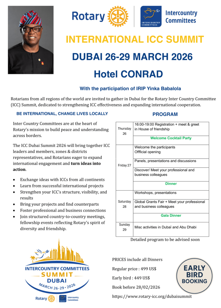 For information on the Rotary Institute in Yas Island, Abu Dhabi (UAE) visit the website: https://2022yasislandrotaryinstitute.org . Inter-Country Committees leaders will participate…